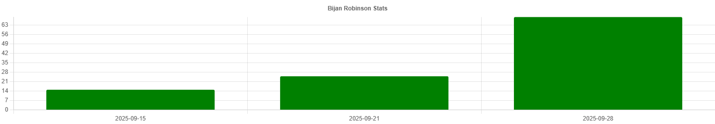 Bijan Robinson (ATL) has surpassed 14.5 yards for his longest reception in 100% of his last 3 games, currently on a 4-game streak.