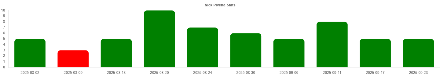 Nick Pivetta (SD) has surpassed 4.5 pitcher strikeouts in 90.0% of his last 10 games and is currently on an 8-game streak above this mark, facing CHC.