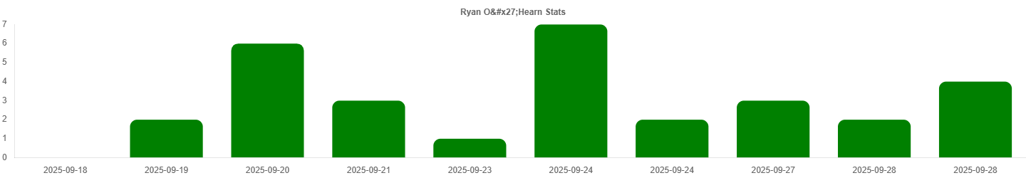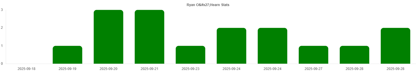 Ryan O'Hearn of the SD has recorded over 0.5 hits in 9 straight games and has achieved this in 90 percent of his last 10 games against all opponents; today, his matchup is against CHC.