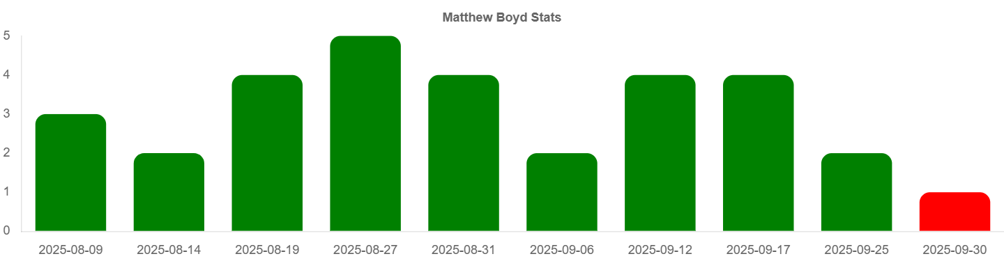 Matthew Boyd has gone over 1.5 earned runs in 90 percent of his last 10 outings, but he's coming into this one with no current streak either way. Just something to keep in mind if you're tracking pitcher trends for Cubs vs. Brewers.